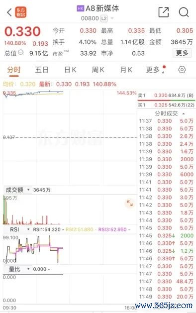 港股A8新媒体复牌暴涨逾140%,截至发稿,涨140.88%,报0.33港元/股,成交额3645万港元。