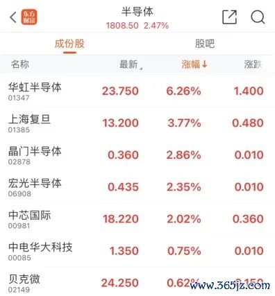 芯片股早盘强势拉升,截至发稿,华虹半导体涨6.26%,上海复旦涨3.77%,晶门半导体涨2.86%,中芯国际涨2.02%。