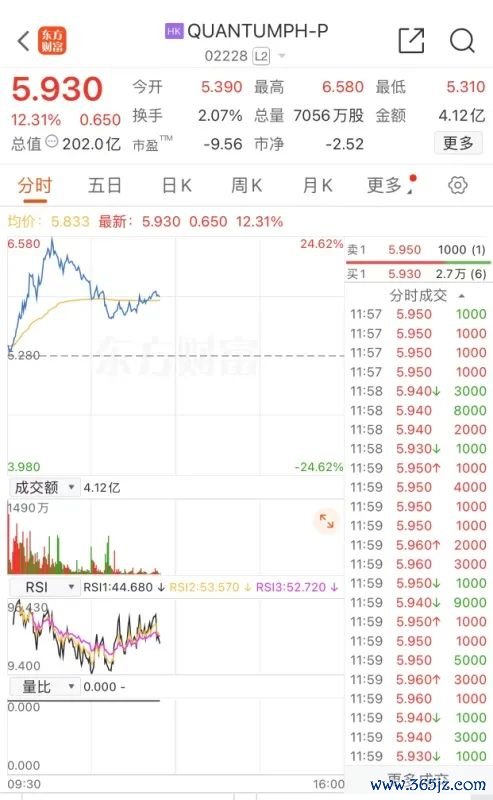 6月13日,港交所“特专科技第一股”QUANTUMPH-P(简称“晶泰科技”)上市,首日挂牌高开2%,盘中进一步走高,一度拉涨24.62%至6.58港元/股。截至午盘,晶泰科技涨12.31%,报5.93港元/股,总市值202亿港元,成交额超4亿港元。