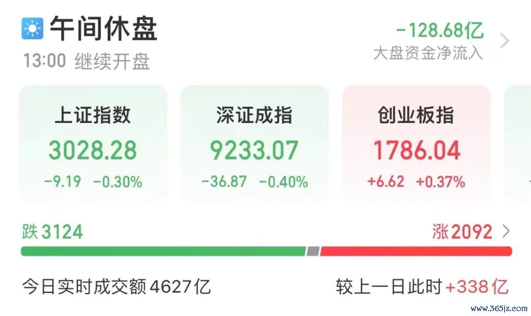 早盘,A股三大指数再度分化股票实盘配资平台,创业板指逆势上涨。截至午间收盘,上证指数跌0.30%,深证成指跌0.40%,创业板指涨0.37%。沪深两市半日成交额4627亿元,较上个交易日同期放量338亿元。